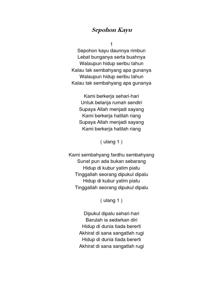 E Am Am E sepohon kayu daunnya rimbun Am E lebat bunganya serta. Am E sepohon kayu daunnya rimbun Am E lebat bunganya serta buahnya Dm Am. Sepohon Kayu 1 Sepohon kayu daunnya rimbun Lebat bunganya serta buahnya Walaupun hidup seribu tahun Kalau tak sembahyang apa gunanya Walaupun hidup seribu tahun Kalau.